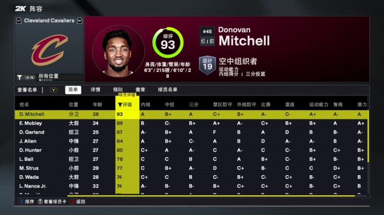 2K26骑士队球员评分:米切尔93领跑全队,莫布里89紧随其后,五人突破80分,鲍尔获评78