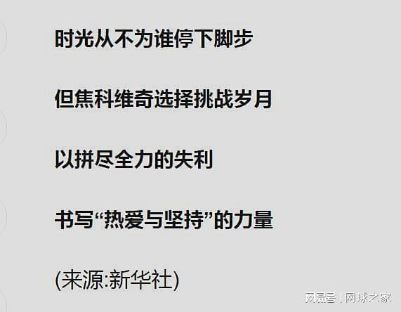 文章中对38岁零9个月的德约科维奇在赛场上展现出的坚韧与拼搏精神给予高度肯定和赞扬,并在文章末尾写道,“时光从不为谁停下脚步,但焦科维奇选择挑战岁月,以拼尽全力的失利书写热爱与坚持的力量!”